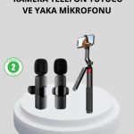 Kablosuz Çift Yaka Mikrofonu ve Tripodlu Selfie Çubuğu İçerik Üretici Seti