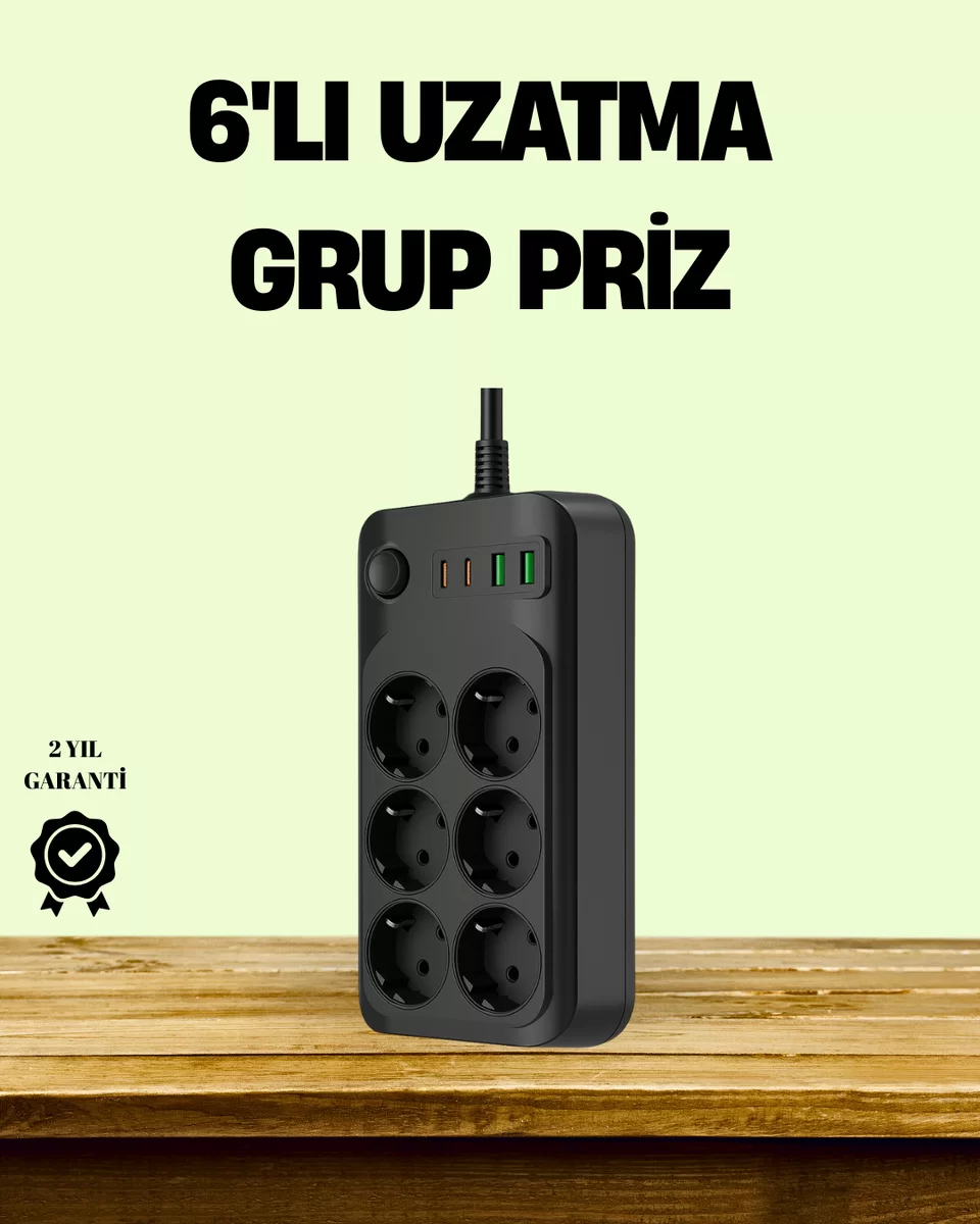 2500W Güçlü 6’lı Priz USB ve Type-C Çıkışlı Termal Korumalı