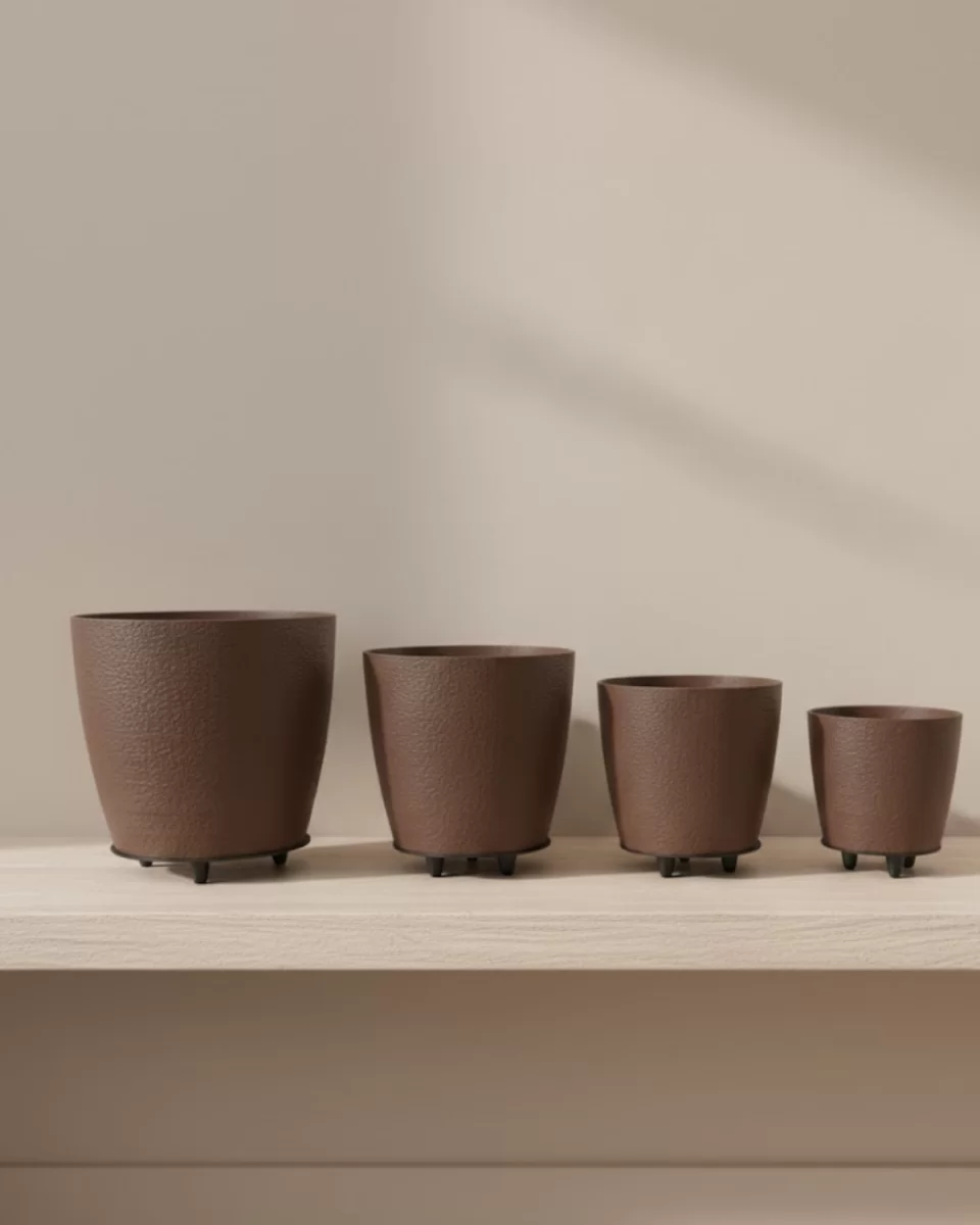 4’lü 3D Kahverengi Dekoratif Vazo Seti Modern Ayaklı Şık Saksı Takımı