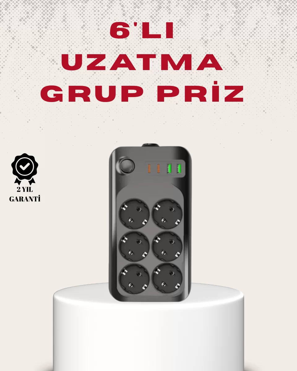 6’lı Grup Priz Termal Korumalı USB Type-C Çoklu Priz 2 Metre Kablo