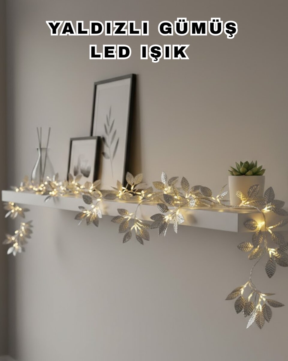 Yaldızlı Gümüş Yaprak LED Işık Pilli Dekoratif Ortam ve Yılbaşı Aydınlatması
